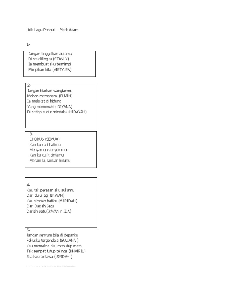 Kau pencuri hatiku Kau yang tlah membuatku merindu Jangan pernah tinggalkan aku kasih. Berikut cuplikan syair nyanyian teks dari lagunya. Berikut cuplikan syair nyanyian teks dari lagunya.